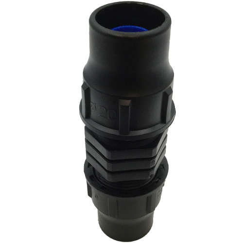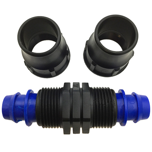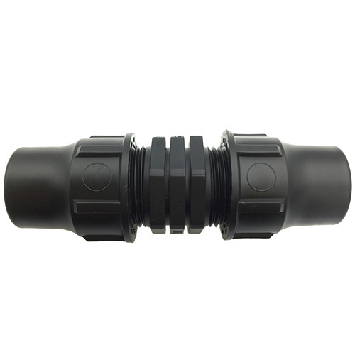 A straight connector with a grip and nut on each end for connecting19mm irrigation pipe.